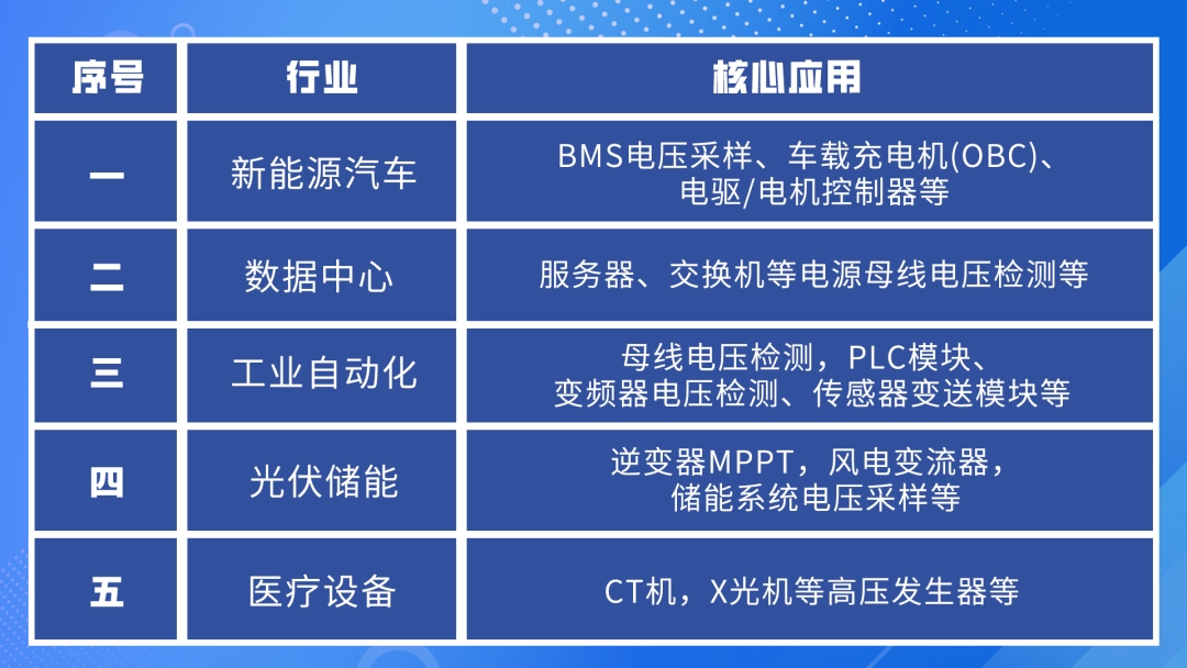 新能源汽車(chē)領(lǐng)域:為BMS電池管理系統(tǒng)電壓采樣、車(chē)載充電機(jī)(OBC)、電驅(qū)控制器提供精準(zhǔn)支撐,讓高電壓檢測(cè)精度與穩(wěn)定性實(shí)現(xiàn)雙重提升,直接助力800V高壓平臺(tái)整車(chē)?yán)m(xù)航與安全性能升級(jí)。