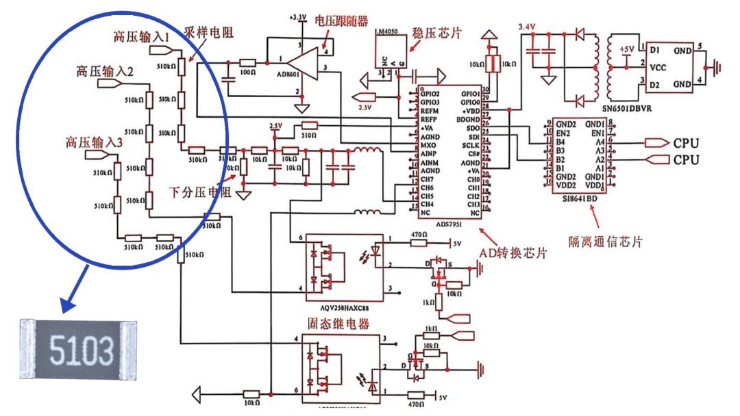 下圖是典型的汽車(chē)BMS的高壓檢測(cè)電路,單機(jī)15顆1206、510kΩ、±25ppm/℃、±0.1%高精密厚膜電阻協(xié)同工作,讓高壓檢測(cè)精度與穩(wěn)定性實(shí)現(xiàn)雙重提升。