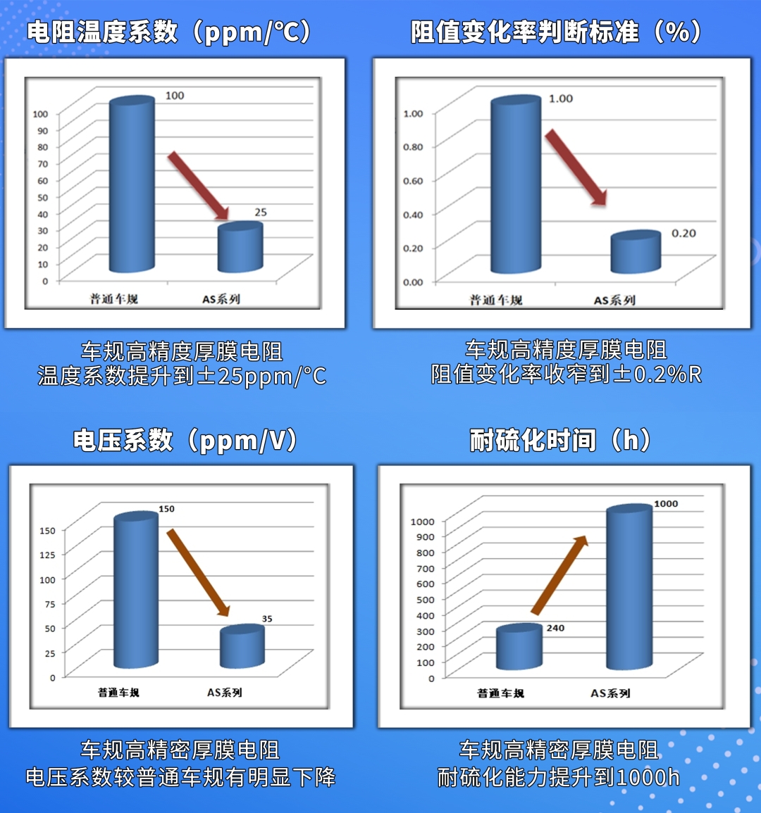 其二,疊加專(zhuān)屬抗硫化專(zhuān)利技術(shù),耐硫化能力提升至1000h,同步攻克銀遷移難題,電壓系數(shù)較普通厚膜電阻大幅優(yōu)化,徹底根除高電壓場(chǎng)景下“失效風(fēng)險(xiǎn)高、穩(wěn)定性差”的行業(yè)痛點(diǎn);其三,嚴(yán)格遵循AEC-Q200車(chē)規(guī)級(jí)可靠性認(rèn)證,符合零缺陷質(zhì)量管理要求,成為國(guó)內(nèi)首家實(shí)現(xiàn)該類(lèi)產(chǎn)品規(guī)模化量產(chǎn)的企業(yè),實(shí)現(xiàn)本土化規(guī)模供應(yīng),助力關(guān)鍵元器件自主可控。具體如下圖所示: